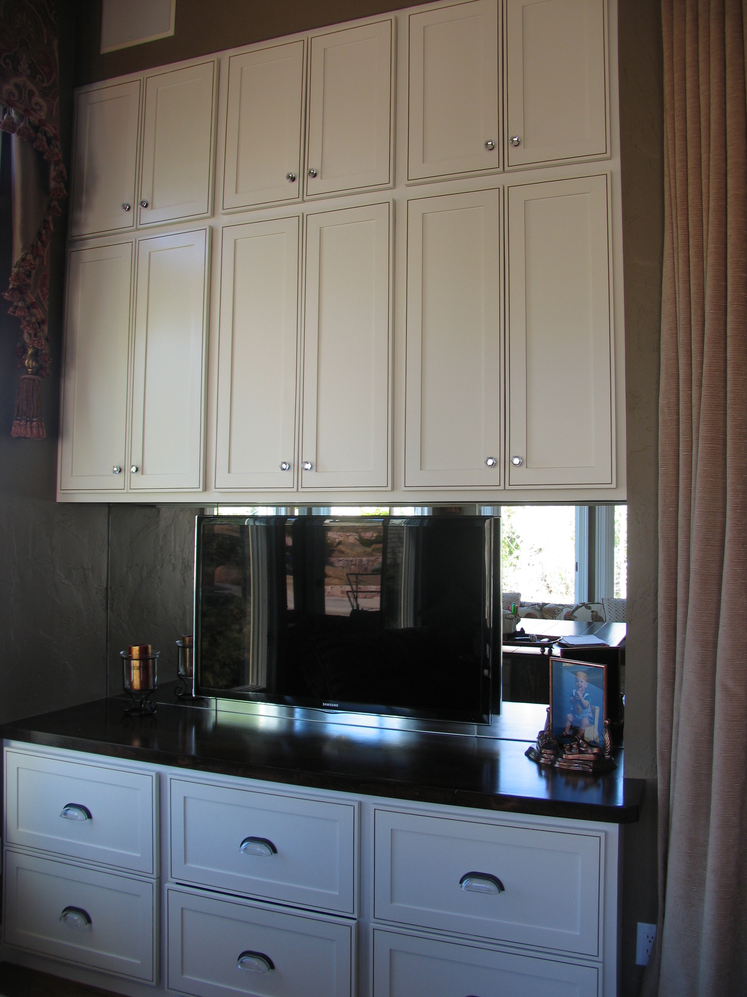 Still wanting nature to take precedence, I mirrored behind the TV to give interest even when the TV isn’t in use. I hid the cable box and Blu-ray player in the upper left lateral file drawer.