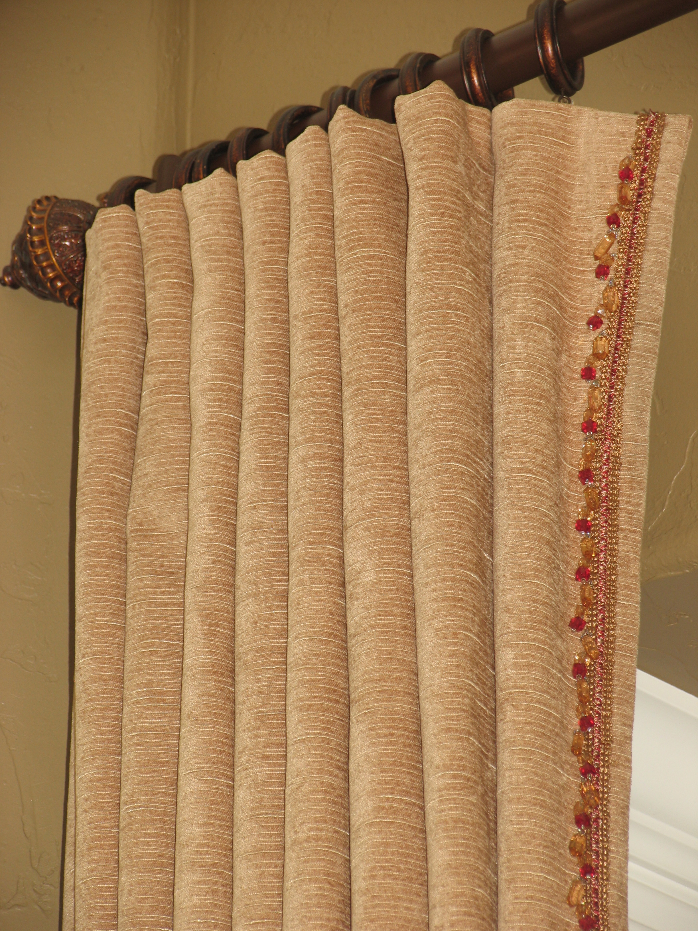 Removed the dark, cherry wood french doors and hung chenille drapery panels to soften the entrance. Removed the dark cherry wood window shutters and painted the windows bright white. Room darkening pleated shades hide beneath the new fabric valances