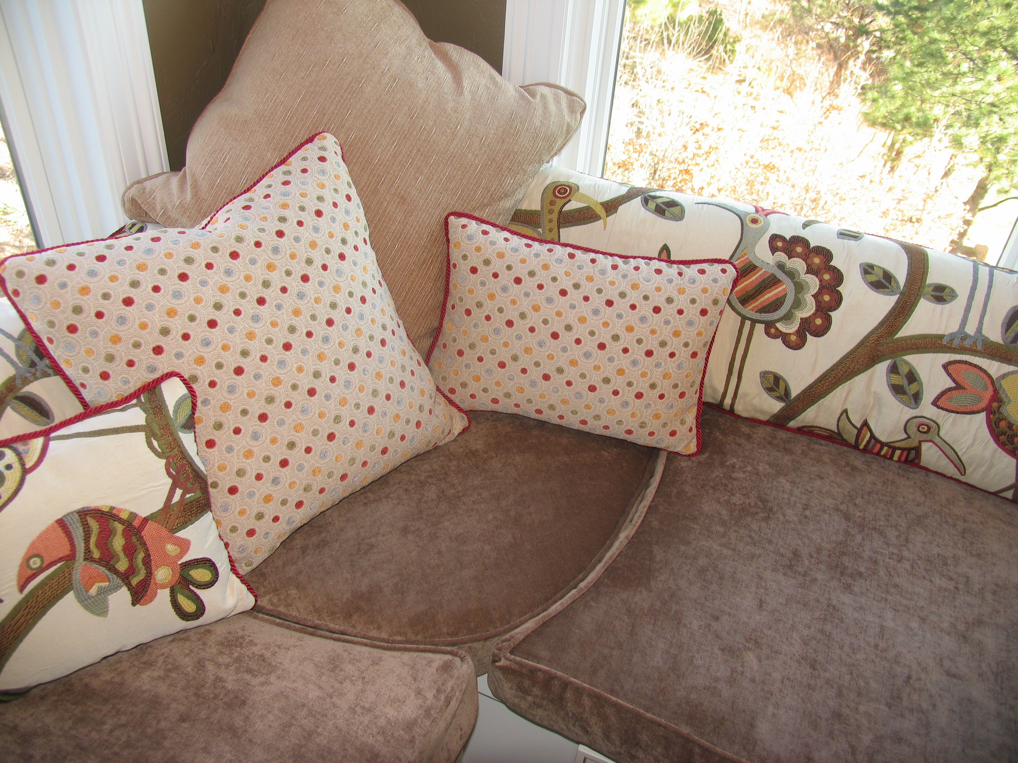 I used mirrors as a back splash at both workstations as well as behind the TV on the adjacent wall to reflect light, nature, and the beautiful fabrics in the room.