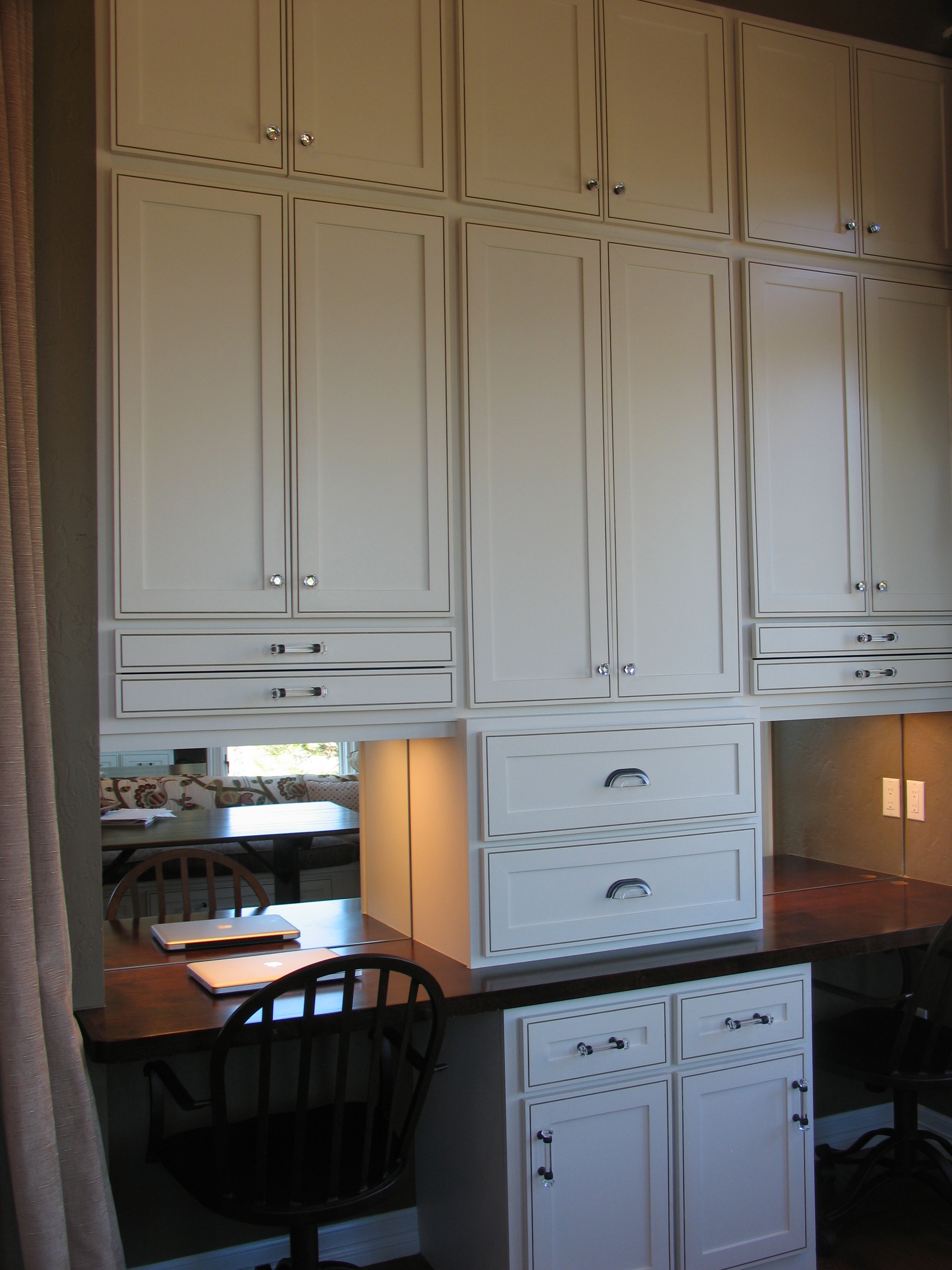As technology progresses and get smaller, workstations become more efficient. Our wireless printer is centrally located in another part of the house. I was intentional about using closed cabinetry to reduce visual clutter. Painting a wall of cabinets creamy white reduces the visual weight in the room. They also show less dust!