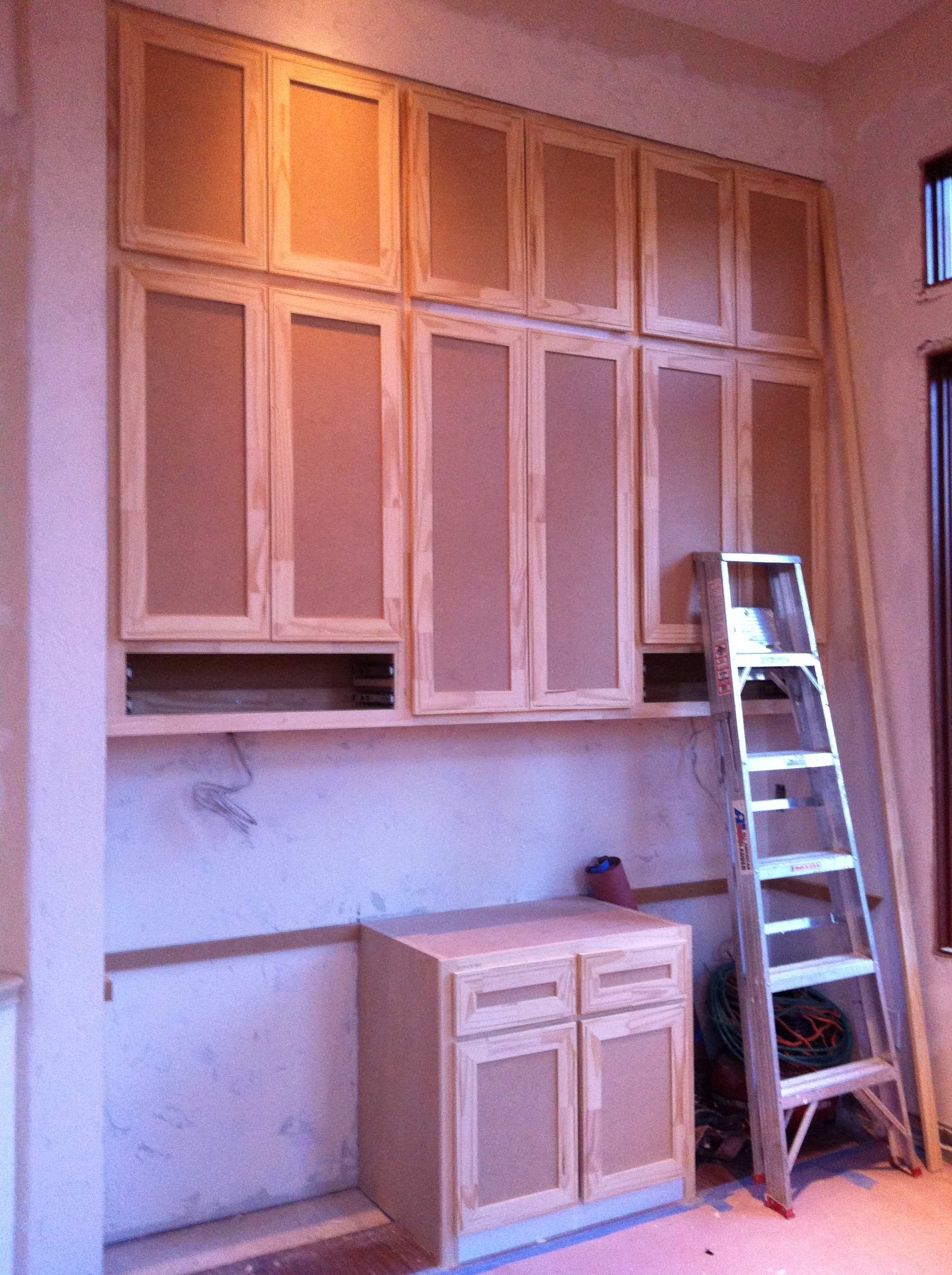 Here’s an example of the dark stained cherry wood and the shallow, open built-in shelving. Work Stations BEFORE